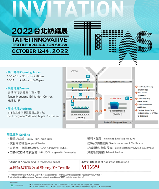 October 12–14 is the “2022 Taipei Innovative Textile Application Show (TITAS 2022)”, as well as the most important innovative textile exhibition in Asia, and we would like to invite you to visit our booth.